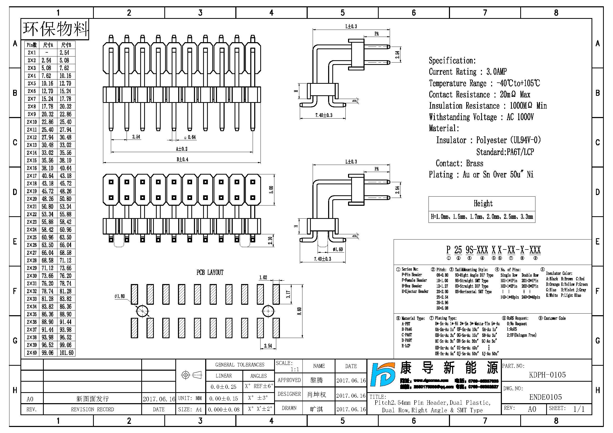 - 產(chǎn)品規(guī)格:2.54MM雙排針,雙塑貼片彎針